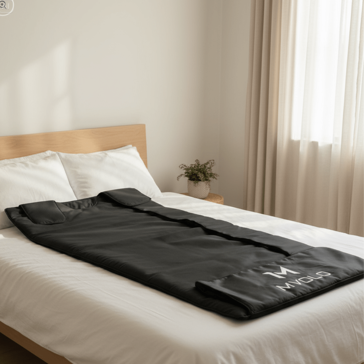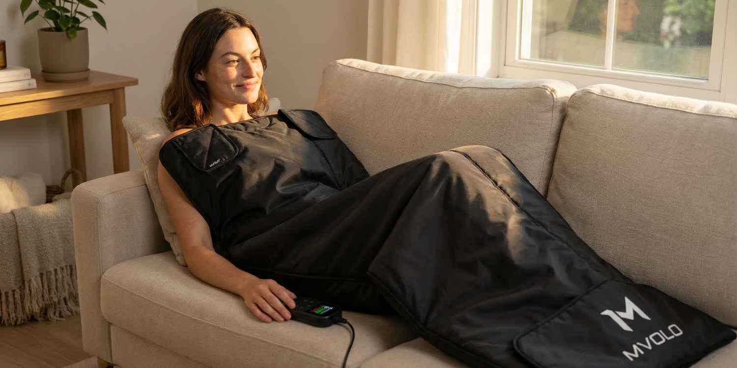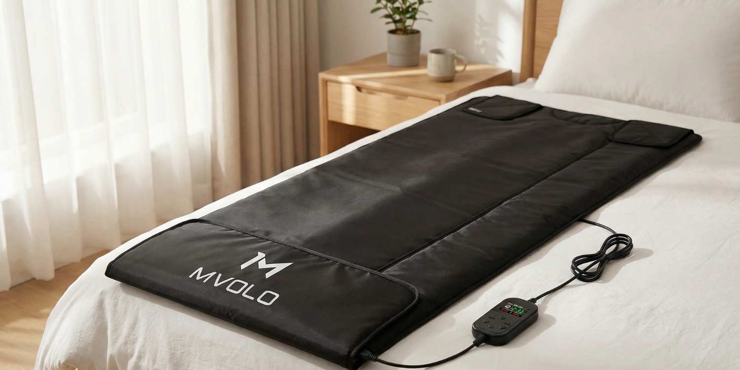 Mvolo Infrarood Sauna Deken biedt diepe ontspanning, ontgifting & pijnverlichting thuis in 30–60 min, veilig en draagbaar.
